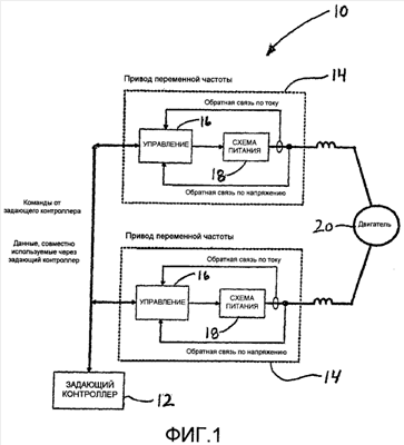 Каждый привод 14 переменной частоты содержит контроллер 16, осуществляющий связь с задающим контроллером 12, и схему 18 питания, осуществляющую связь с контроллером 16. Каждая схема 18 питания связана с обмоткой двигателя 20. В соответствии с различными вариантами осуществления каждая схема 18 питания может быть связана с отличающейся обмоткой многообмоточного двигателя переменного тока, с одной обмоткой однообмоточного двигателя переменного тока или любой комбинацией того и другого. Специалисту в данной области техники должно быть понятно, что система 10 может быть использована с любым типом двигателя переменного тока, таким как синхронный двигатель, индукционный двигатель или двигатель с постоянным магнитом. Для применений синхронных двигателей каждый привод 14 переменной частоты может также включать в себя источник возбуждения, который включается/выключается контроллером 16, и каждый источник возбуждения может быть соединен с возбудителем для схемы возбуждения двигателя, как известно в технике. Как показано на фиг.1, для каждого привода 14 переменной частоты напряжение, выведенное связанной схемой 18 питания, подается назад на связанный контроллер 16, и ток, выведенный связанной схемой 18 питания, также подается назад на связанный контроллер 16.