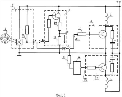 Напряжение U1 повторяет по фазе напряжение, сформированное датчиком положения UD. Напряжение инвертором 6 формируется в противофазе напряжению U1. В качестве инвертора может быть использован инвертор на микросхеме, на транзисторном усилителе и др.