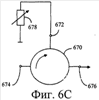 На фиг.6С показан пример, в котором согласующий компонент представляет собой циркулятор 670 с тремя выводами 672-676. В этом примере вывод 672 связан с блоком 678 регулируемого сопротивления. Когда передача происходит от вывода 674 к выводу 676, вывод 676 представляет собой выходной вывод. Любой из других выводов также может быть соединен с блоком регулируемого сопротивления.