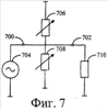 На фиг.7 показан другой пример регулирующей схемы, предназначенной для регулировки амплитуды сигнала. Регулирующая схема на фиг.7 содержит входной вывод 700 и выходной вывод 702. В общем случае схема может содержать множество выводов для входа и выхода сигнала. Генератор 704 сигналов подает сигнал на входной вывод 700. Параллельно между линией сигнала (линия между выводами 700, 702) и землей включена пара блоков 706, 708 регулируемого импеданса. Земля может быть нулевым потенциалом или любым другим опорным уровнем, относительно которого изменяют сигнал на сигнальной линии. Блок 706 регулируемого импеданса может быть индуктивным, а блок 708 регулируемого импеданса может быть емкостным. В общем случае схема может содержать больше одной пары блоков регулируемого импеданса, так чтобы каждая пара блоков регулируемого импеданса находилась между одной парой входных и выходных выводов. Блоки регулируемого импеданса в каждой паре имеют комплементарные друг другу реактивные сопротивления. Нагрузка 710, которая может быть нелинейным элементом, например усилителем, соединена с выходным выводом 702. Как на фиг.6А, 6В и 6С, каждый блок регулируемого импеданса может содержать множество компонентов, соединенных параллельно и/или последовательно.
