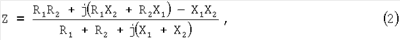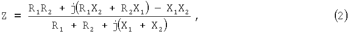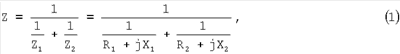 где R1+jX1 – первый блок с импедансом Z1, R2+jX2 – второй блок с импедансом Z2, R1 – активная часть импеданса первого блока, R2 – активная часть импеданса второго блока, X1 – реактивная часть импеданса первого блока, X2 – реактивная часть импеданса второго блока, a j – мнимая единица. Импеданс Z может быть также выражен как