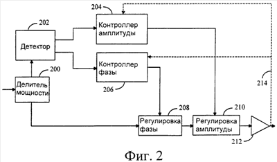 Например, на фиг.2 делитель 200 мощности делит сигнал, подаваемый на нелинейный элемент, на два компонента, первый из которых поступает в детектор 202, а второй проходит по меньшей мере в одну регулирующую схему 208, 210. Второй компонент сигнала может быть задержан (на фиг.2 такой вариант не показан), так чтобы эта задержка соответствовала задержке первого компонента сигнала в детекторе 202 и по меньшей мере в одном аналоговом контроллере 204, 206. Детектор 202 измеряет мощность сигнала и может представлять собой детектор огибающей. Сигнал с выхода детектора 202 поступает по меньшей мере в один аналоговый контроллер 204, 206, каждый из которых формирует управляющий сигнал в виде кусочной аппроксимации нелинейной зависимости между по меньшей мере одним параметром и измеренной мощностью входного сигнала. Аналоговые контроллеры, изображенные на фиг.2, могут представлять собой контроллер 204 амплитуды и контроллер 206 фазы. Управляющий сигнал из каждого аналогового контроллера 204, 206 может быть подан в регулирующую схему 208, 210 для регулировки по меньшей мере одного параметра второго компонента сигнала согласно управляющим сигналам. Входной сигнал по меньшей мере с одним управляемым параметром подается затем в нелинейный элемент 212. Поскольку нелинейный элемент 212 может быть усилителем мощности, усиливающим радиочастотный сигнал, усиленный сигнал может быть подан в антенну для его передачи в виде электромагнитного излучения. Усиливаемый сигнал может также быть принятым сигналом, поступающим из антенны в усилитель. Радиочастотный сигнал может быть сигналом в основной полосе частот или сигналом модулированной несущей, частота которого может меняться от килогерц до гигагерц. Таким образом, данная электронная схема может быть использована, например, в базовой станции или в мобильном оборудовании.