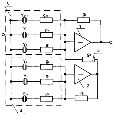 На чертеже приведена электрическая схема предлагаемого устройства. Устройство состоит из первого 1 и второго 2 инвертирующих операционных усилителей с отрицательными обратными связями, первой группы 3, состоящей из N пьезорезонаторов, первые выводы которых подключены к входной потенциальной клемме устройства, а вторые выводы соединены через N резисторов со входом первого операционного усилителя, второй группы 4, состоящей из N пьезорезонаторов, первые выводы которых соединены с входной потенциальной клеммой устройства, а вторые выводы через N резисторов со входом второго операционного усилителя, дополнительного резистора 5, соединяющего выход второго операционного усилителя со входом первого операционного усилителя, выход которого является выходом устройства.