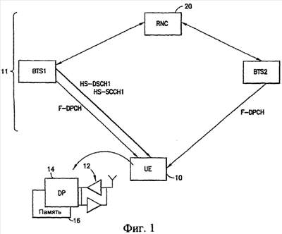 Как проиллюстрировано на фиг.1, терминал 10 HSDPA включает подходящий беспроводной приемопередатчик 12, подсоединенный к процессору данных 14 (DP), который в свою очередь включает или подсоединяется к энергозависимой и/или энергонезависимой памяти 16. Процессор 14 данных может быть интегральной схемой, действующей на компьютерной микросхеме. Устройство памяти 16 хранит управляющую программу, которая выполняется процессором 14, для работы с базовыми станциями BTS1 и BTS2, включая управляющую программу, которая предусматривается для реализации терминала 10 HSDPA согласно этому изобретению. Хотя это и не показано, считается, что базовые станции построены по одинаковому принципу. Контроллер радиосети RNC 20 также включает процессор данных DP и устройство памяти, которое хранит управляющую программу, выполняемую процессором данных DP контроллера радиосети RNC 20. Исходный узел В (BTS 1), целевой узел В (BTS2) и контроллер радиосети RNC 20 могут считаться элементами сети UTRAN 11.