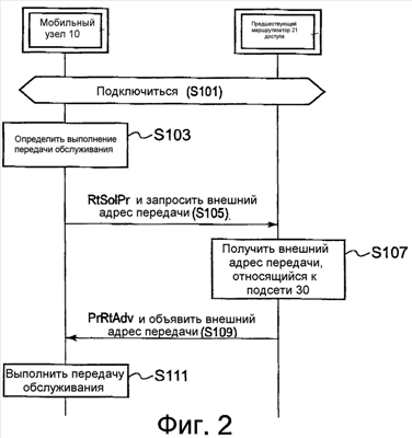 В результате MN10 может получить от NAR31 внешний адрес передачи, относящийся к подсети 30, непосредственно после передачи обслуживания. То есть MN10 может быстро выполнить пакетную передачу наружу (например, CN40) в подсети 30 посредством настройки локального адреса связи NAR31, полученного с помощью вышеописанной процедуры, либо локального адреса связи маршрутизатора 37 по умолчанию, в передаче пакета непосредственно после выполнения передачи обслуживания к линии связи подсети 30.