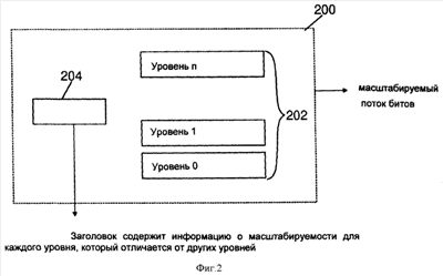 На фиг.2 в одном из примеров выполнения настоящего изобретения иллюстрируется сигнализация о наборе информации, включающем по меньшей мере информацию об одной характеристике для каждого уровня масштабируемого потока 200 битов. Каждый уровень масштабируемого потока битов характеризуется набором, включающим по меньшей мере информацию об одной характеристике, которую передают для этого уровня, что позволяет выбрать уровень для декодировании или передачи согласно набору, включающему информацию по меньшей мере об одной характеристике. Такие характеристики могут храниться в заголовке 204. Множество уровней 202 представляют собой множество уровней в масштабируемом потоке битов.