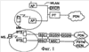 На фиг.1 показан один из примеров системы связи, состоящей из беспроводной локальной сети WLAN и сети наземной мобильной связи общего пользования PLMN, а именно сети GSM/GPRS. Беспроводная локальная сеть WLAN содержит устройства доступа, называемые точками доступа АР, которые предлагают радиодоступ к подвижной станции MS и таким образом образуют окончание широкополосной радиолинии. Точка доступа АР управляет радиоинтерфейсом в соответствии с используемой технологией радиосвязи, например, в соответствии со стандартом IEEE 802.11 в одной из предпочтительных форм осуществления изобретения. Беспроводное сетевое соединение также может быть установлено непосредственно между двумя подвижными станциями MS, включающими приемопередатчик беспроводной локальной сети WLAN (режим “Ad hoc”). Спецификация IEEE 802.11 определяет протоколы как физического уровня, так и уровня MAC для передачи данных через радиоинтерфейс. Точка доступа АР обслуживает также установление мостов или маршрутизацию потоков данных радиоинтерфейса к другим сетевым узлам и от них. Беспроводная локальная сеть WLAN может также обеспечивать интерфейс шлюза к сетям пакетной передачи данных PDN, таким как Интернет, через устройство, называемое порталом РТ или мостом. Как правило, беспроводная локальная сеть WLAN содержит также другие серверы, такие как сервер DHCP (Dynamic Host Configuration Protocol – протокол динамической конфигурации хост-машины), который распределяет IP-адреса подвижным станциям MS. Как правило, в области, где есть зона охвата беспроводной локальной сети WLAN, есть также зона охвата наземной мобильной сети общего пользования PLMN.