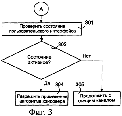 В одной альтернативной форме осуществления изобретения по крайней мере часть описанных выше шагов осуществляется как часть алгоритма хэндовера НОА. Таким образом, когда алгоритм хэндовера НОА инициируется по некоторым причинам (точка А), выполняется проверка согласно шагам 301 и 302. Если состояние компонента пользовательского интерфейса неактивное, НОА останавливается, то есть применение НОА не допускается и продолжается использование текущего канала. Если состояние активное, то НОА может выполняться с типичными задачами, связанными с алгоритмом хэндовера. Таким образом, не требуются отдельные средства управления (СМ) применением алгоритма хэндовера, а алгоритм хэндовера НОА может самостоятельно определять, может ли он быть применен.