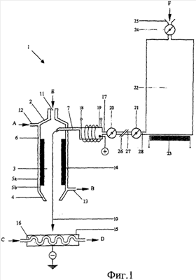 Теперь обратимся к фиг.1. Катод 15, играющий роль отрицательного электрода в представленном варианте выполнения предложенной горелки 1, расположен напротив наконечника 4 корпуса 2 горелки на расстоянии от него. Катод 15 предпочтительно имеет полую внутреннюю часть, и, следовательно, по нему может циркулировать хладагент 16, как показано стрелками «С» и « D» на фиг.1. Катод 15 выполняет двойную функцию: с одной стороны, на его поверхности располагают мишень (не показана на фиг.1), которая должна подвергаться воздействию плазменной дуги 10, образованной парами металла, а с другой стороны, в нем заключена плазменная дуга 10. Кроме того, что катод 15 способен охлаждаться, дополнительное преимущество конструкции катода, изображенного на фиг.1, состоит в том, что непосредственное охлаждение катода 15, которое выполняется хладагентом 16, циркулирующим по нему, позволяет точно управлять течением реакций мишени. Охлаждающий контур катода 15 может быть образован как часть охлаждающего контура корпуса 2 горелки, однако он также может быть независимым контуром. В дополнительных вариантах выполнения предложенной плазменной горелки 1 мишень сама по себе может играть роль катода 15. Однако в таких случаях в отсутствие катода 15 невозможно осуществить точное управление течением химической реакции (реакций).