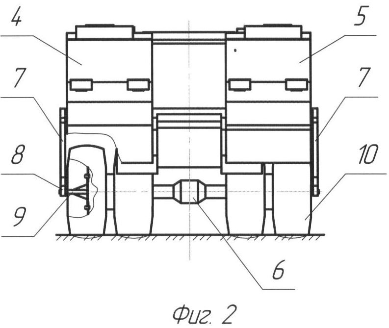 Если же возникает необходимость в увеличении массы перевозимых технологических материалов или снижения удельного давления движителей тягово-транспортного колесного средства на почву, то дополнительные бункеры можно установить с опорой на передний мост по указанному выше способу.