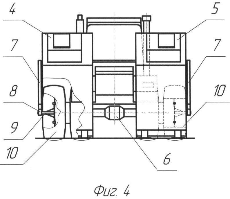 Фиг.4 – колесно-тяговое средство с бункером, опирающимся на землю при его отсоединении (подсоединении) вид сзади.