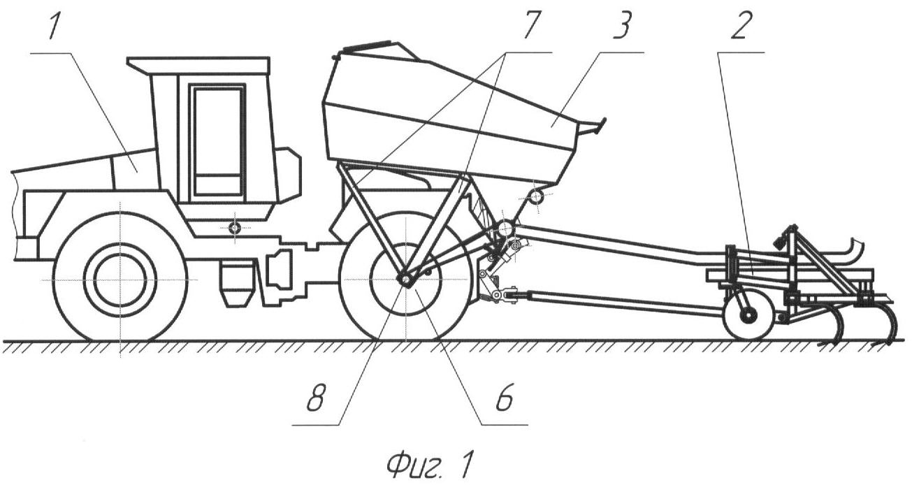 Фиг.3 – колесно-тяговое средство с бункером, опирающимся на землю при его отсоединении (подсоединении).