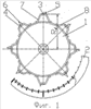 фиг.3 – развертка поверхности барабана, когда одинаково ориентированные зубья расположены на четвертях цилиндрической поверхности барабана, разделенных диаметральной плоскостью и плоскостью, перпендикулярной оси барабана и делящей его длину пополам;