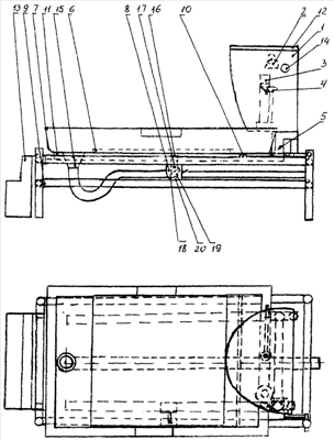 Механизм контроля 8 перемещения емкости 7 выполнен в корпусе 18, на дне которого размещен элемент стопорения 19 с выемкой, вокруг которого перемещается штырь 17 при изменении угла наклона емкости 7. На нижней стенке корпуса 18 выполнен выступ 20 для регулирования положения штыря 17 в выемке. Механизм контроля 8 перемещения емкости 7 закреплен на основании 9, открытой частью корпуса 18 внутрь конструкции.