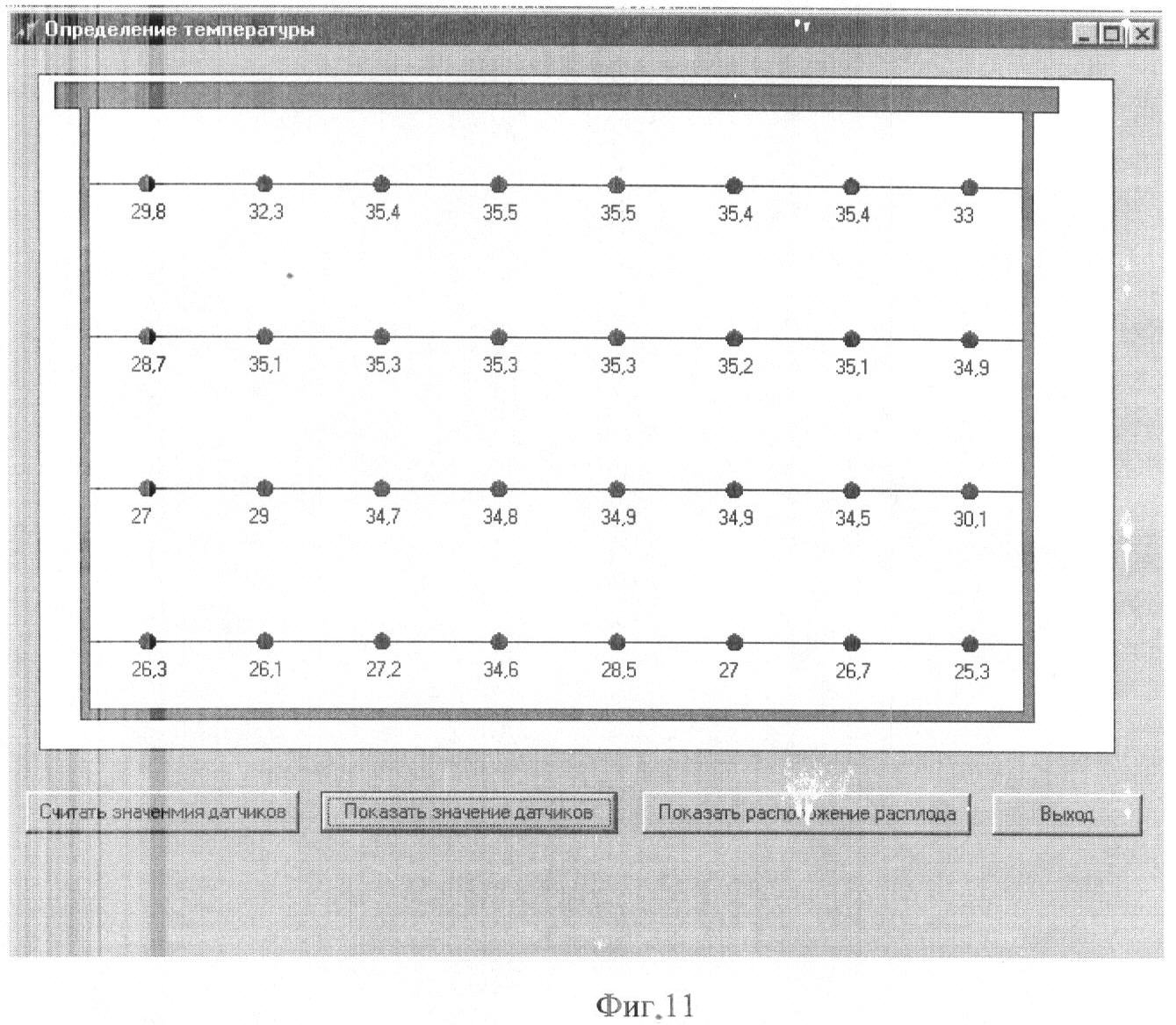 Опрос датчиков специализированного съемного адаптера температур 12 происходит следующим образом. МикроЭВМ улья 7 подает на дешифратор специализированных съемных адаптеров температур 8 код, который разрешает работу специализированного съемного адаптера температур. МикроЭВМ улья 7 по шине 13 выдает адресные коды на коммутатор по оси Y 10, который осуществляет подачу напряжений, соответствующих температурам датчиков, к информационному входу микроЭВМ улья 7. МикроЭВМ улья 7 по шине 14 определяет столбцы опрашиваемых датчиков, подавая соответствующий код на коммутатор по оси Х специализированного съемного адаптера температур 11.