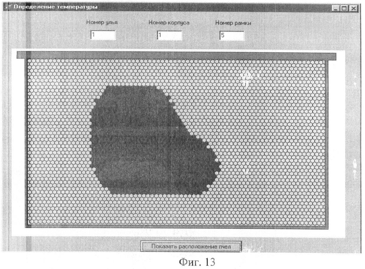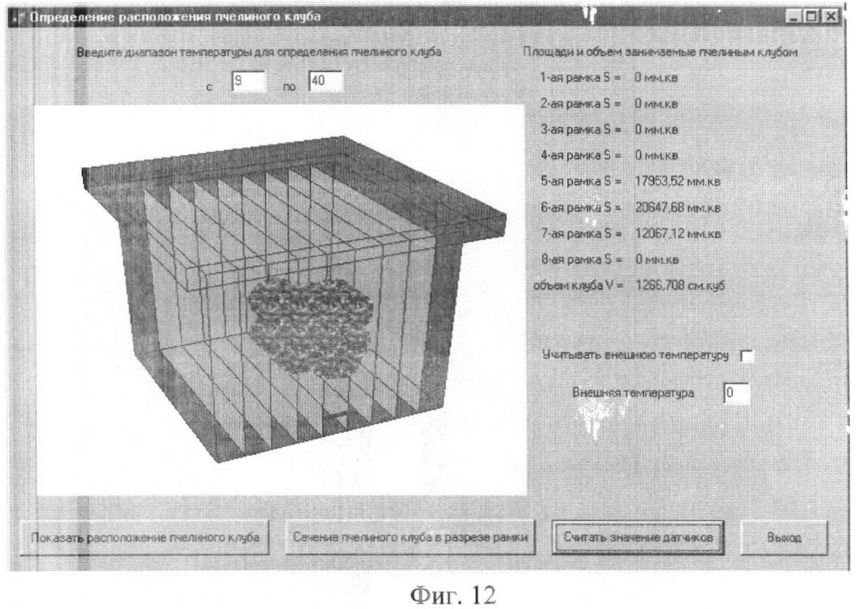 При наличии большего числа съемных адаптеров температур устанавливается объем пчелиного клуба (фиг.13). Программа представляет возможность пользователю визуально наблюдать за расположением пчелиного клуба в улье. Создается модель пчелиного улья, которую можно поворачивать вокруг осей х, у и z. Для анализа состояния пчелиной семьи необходимо нажать кнопку “Считать значения датчиков”, при этом происходит визуализация расположения пчелиного клуба в улье, а также вычисляется площадь сечений (фиг.12) пчелиного клуба и объем пчелиного клуба. Для просмотра сечений пчелиного клуба необходимо нажать кнопку “Сечение пчелиного клуба” и выбрать соответствующее сечение. Улей с пчелиным клубом можно разворачивать, обеспечивая более удобное наблюдение сверху, сбоку.