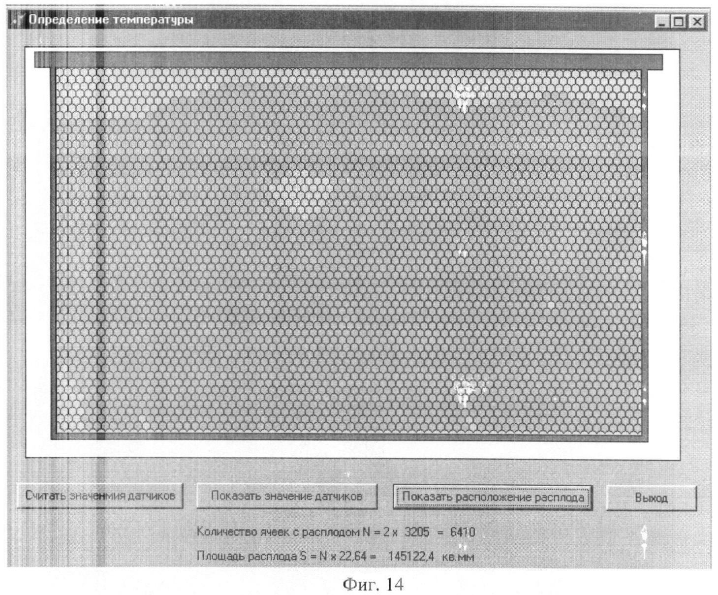 На вход программы подается массив размером 8×4, соответствующий показаниям датчиков температур (алгоритм работы программы, фиг.10). Для того чтобы вычислить площадь сечения пчелиного клуба, устанавливаются крайние температуры датчиков, соответствующие выживанию пчел. Температура между датчиками апроксимируется. Термодатчики в количестве 8×4 размещены равномерно по всей плоскости специализированного съемного адаптера температур, который соседствует с реальной пчелиной рамкой с сотовыми ячейками. Количество пчелиных ячеек в пчелиной рамке по координате Х составляет 76, количество пчелиных ячеек по координате Х между соседними термодатчиками составит 8, по координате Y количество пчелиных ячеек между датчиками составит 11. Вычисляется разница температур t между соседними датчиками выбранного направления в плоскости специализированного съемного адаптера температур, делится на количество между ними сотовых ячеек n, вычисляется X. Температура сотовой ячейки t определяется согласно выражению (1)