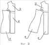 Рассмотрим использование заявляемой одежды на примере верхней одежды, например плаща или пальто. Купив в начале беременности такую одежду, женщина на первых порах носит ее без клиньев, соединив половинки застежки-молнии 8. Поскольку фигура пока без особенностей, посадка на фигуре и баланс длины соблюдены. По мере увеличения объема тела одежда становится не только мала, но и наблюдается нарушение баланса длины переда по сравнению с длиной спинки. В этом случае, приподняв нижний край отлетной кокетки 6 и расстегнув застежку-молнию 8, будущая мама вставляет клинья-вставки 9 с помощью застежек-молний 10. Одежда расширяется на нужную ширину, а баланс длины восстанавливается за счет опускания нижней части 4 полочки 1 по липуну 11. При этом не только восстанавливается баланс, но и компенсируется увеличение длины верхнего среза нижней части 4 полочки 1 (см. фиг.3). При дальнейшем увеличении объема тела, клинья-вставки 9 заменяются на более широкие и так до появления на свет малыша. Опытная проверка показала, что, как правило, вполне достаточно двух типоразмеров клиньев-вставок 9. Большее количество клиньев вставок может понадобиться в случае ожидания более одного малыша. В послеродовой период женщина убирает клинья и носит одежду в традиционном исполнении, т.е. без клиньев. Однако нередки случаи, когда в период лактации женщина поправляется. В этом случае ее также выручат клинья-вставки 9, которые позволят ей быть удобно и красиво одетой, не тратя время и деньги на поиски новой одежды.