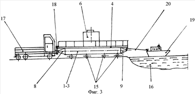 Сборку судна производят в два этапа: 1-й этап – непосредственно на заводе-изготовителе вдали от водоема и 2-й этап – на берегу водоема. Следует отметить, что особых требований к заводу-изготовителю, как к судостроительному предприятию, не предъявляется. Судно может быть построено на любом заводе, имеющем ограниченные производственные площади. Сборку судна начинают с установки и юстировки корпусов 1, 2 и 3. Затем монтируют палубу 4 и устанавливают на ней надстройку 6. Монтируют релинги 5. Устанавливают двигатель 7. После этого судно разбирают на блоки, которые можно перевезти автотранспортом, и перевозят их к месту 2-го этапа сборки – к водоему. Здесь готовят площадку, укладывают на ней катки 15, ориентируя их так, чтобы продольная ось их была параллельна берегу водоема 16. Разгружают блоки судна с автотранспорта стреловым краном, устанавливают и юстируют корпуса 1, 2 и 3 перпендикулярно оси катков, а затем производят монтаж блоков судна в последовательности, обратной разборке судна после завершения 1-го этапа сборки. После сборки судна спуск его на воду осуществляют или ходом автомобиля 17, установив между бампером автомобиля и носом судна амортизаторы в виде автомобильных шин 18, или буксиром 19 при помощи буксировочного каната 20.