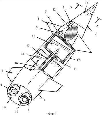 2. Гиперзвуковой самолет по п.1, отличающийся тем, что в носовой конической части радиально установлены четыре управляющих реактивных сопла, соединенных через регуляторы с вспомогательным газогенератором.