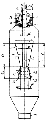 На чертеже представлен общий вид реактора синтеза диоксида кремния методом пламенного горения кремнийорганических жидкостей. Устройство состоит из горизонтального (вертикального) цилиндрического корпуса 1, горелочного устройства 2 с узлом управления и ввода реагирующих компонентов, который имеет канал 3 для подачи жидких кремнийорганических соединений, центральный канал 4 – для подачи воздуха, канал 5 – для подачи водорода и канал 6 – для подачи азота. Внутри корпуса реактора соосно горелке установлен стабилизатор пламени, выполненный из двух труб – внешней 7 и внутренней 8. Внешняя труба, изготовленная в форме сопла Лаваля, состоит из конфузора 9 и перфорированного отверстиями 13 диффузора 10. Диффузор имеет рубашку, разделенную на две секции 11 и 12. Стабилизатор в сборе и его внутренняя труба 8 выполнены с возможностью перемещения по оси. Горелочное устройство включает также канал 14 и кольцевой канал 15. Реактор оснащен патрубком 16 для вывода смеси абгазов и диоксида.