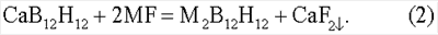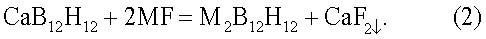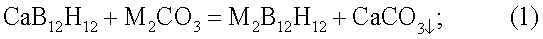Изобретение относится к химии бора, конкретно к получению химических соединений с додекагидро-клозо-додекаборатным анионом, которые находят применение в качестве твердых электролитов, химически и термически стойких полимерных материалов, катионообменных смол, энергоемких компонентов, радиопротекторов в медицине и т.д. Известен способ синтеза додекагидро-клозо-додекабората натрия Nа2В12Н12, включающий взаимодействие декаборана-14 В10Н14 с тетрагидроборатом натрия NaBH4 в диглиме (D), выделение образовавшегося диглимата состава Na2B12H12·9D из реакционной смеси экстракцией горячим растворителем и последующую кристаллизацию при охлаждении. Образовавшийся кристаллический осадок Na2B12H12·9D отфильтровывают и затем разлагают при 100°С с вакуумной отгонкой диглима и получением целевого Na2B12H12 (Stewart A.S., Schaffer G.W. J. Inorg. Nucl. Chem. 1956. V.3. Недостатком этого способа является использование пожароопасного и дорогого растворителя, существенное загрязнение Na2B12H12 остатками диглима и продуктами его распада при разложении Na2B12H12·9D, что в дальнейшем требует дополнительной очистки. Для этого полученный продукт растворяют в воде и проводят 2-кратную отгонку растворителя под вакуумом при нагревании до 150-180°С. Однако все эти операции не позволяют очистить Na2B12H12 от примесей, образующихся в процессе синтеза, в том числе боратов, образующихся при гидролизе исходного NaBH4, а также низших полиэдрических боргидридных анионов, являющихся неизбежными побочными продуктами этого способа, которые переходят в целевой продукт. Сочетание повышенной температуры и пожароопасного (и недешевого) растворителя делает невозможным применение этого способа в крупномасштабном исполнении, удорожает конечный продукт и не обеспечивает его высокой чистоты. Известен способ получения додекагидро-клозо-додекабората калия K2B12H12 путем нагревания при температуре 500-550°С и давлении 4-6 атм смеси тетрафторобората калия KBF4 с гидридом кальция СаН2 в заданном отношении. В результате образуется спек, содержащий помимо целевого продукта примеси фторидов калия и кальция, а также исходного тетрафторобората калия. Для получения чистого продукта спек растворяют в воде и отфильтровывают нерастворимые примеси. К фильтрату, содержащему анионы додекагидро-клозо-додекаборной кислоты, добавляют гидроксид цезия CsOH в небольшом избытке от стехиометрии для осаждения додекагидро-клозо-додекабората цезия Cs2B12H12. Полученную соль цезия несколько раз перекристаллизовывают до требуемой степени чистоты. Далее Сs2В12Н12 растворяют в дистиллированной воде и полученный раствор пропускают через катионообменную колонку, заполненную смолой КУ-2. Полученный на выходе из колонки раствор додекагидро-клозо-додекаборной кислоты H2B12H12 нейтрализуют раствором гидроксида калия КОН до рН 7 с образованием целевого продукта – К12В12Н12. Додекагидро-клозо-додекаборат калия выделяют из раствора упариванием до получения сухого остатка постоянного веса (а.с. СССР Способ имеет ряд недостатков. Прежде всего, работа с водородом при температуре выше 500°С и повышенном давлении делает способ взрывоопасным. Недостатком способа также являются значительные потери цезиевой соли (до 2,5 г Cs2B12H12 на 100 г воды) при выделении и очистке B12H12 Наиболее близким к заявляемому решению по технической сущности является способ получения додекагидро-клоз
