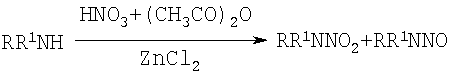 Изобретение относится к области химии органических нитросоединений, а именно к способу получения соединений класса вторичных нитраминов, которые находят применение в качестве гербицидов, эффективных стимуляторов роста растений, антисептиков, присадок к смазочным маслам и топливам, а также в оборонной промышленности. Известен способ получения вторичных нитраминов путем взаимодействия нитратов циангидринов с вторичными аминами в среде органического растворителя (ацетонитрил, диметилформамид) при 80°С с выходами вторичних нитраминов 55-80% [Emmons W.D., Freeman J.P. Alkaline Nitration. I. The Nitration of Amines with Cyanohydrin Nitrates. J. Am. Chem. Soc, 77, 4387 (1955)]. Недостатками этого метода является необходимость предварительного получения нитрующего агента – нитрата циангидрина, использование избытка вторичного амина, а также использование пожароопасных и токсичных растворителей. Известен также способ получения вторичных нитраминов путем взаимодействия соответствующих аминов с оксидом азота (V) в среде четыреххлористого углерода при температуре -20÷-30°С с выходами нитраминов 64-97% [Emmons W.D., Pragano A.S., Stevens Т.Е. Nitration of Amines with Dinitrogen Pentoxide. J. Org. Chem. Soc., 23, 311 (1958)]. Недостатками данного метода является проведение процесса при низких температурах, предварительное получение оксида азота (V) из абсолютной азотной кислоты и трифторуксусного ангидрида и использование токсичных хлорорганических растворителей, их дальнейшая очистка и утилизация. Наиболее близким к предлагаемому изобретению является способ получения вторичных нитраминов путем нитрования вторичных аминов смесью абсолютной азотной кислоты и уксусного ангидрида в присутствии в качестве катализатора хлористого цинка [Chute W.J., Dunn G.E., MacKenzie J.C., Myers G.S., Smart G.N.R., Suggitt J.W., Wright G.F. Catalyzed Nitration of Amines. Can. J. Res., 26B, 114 (1948), патент US 2461582]. Процесс ведут при температуре 20-55°С при атмосферном давлении в среде уксусного ангидрида или смеси уксусного ангидрида и уксусной кислоты. Выходы вторичных нитраминов в зависимости от исходных аминов составляют 17-93%. Следует отметить, что получение вторичных нитраминов по данному способу проводят в среде реагентов, то есть при высокой концентрации нитрующего агента (ацетилнитрата), что делает процесс пожаро- и взрывоопасным. Другим недостатком этого процесса является образование в некоторых случаях в качестве побочного продукта, кроме N,N-диалкилнитрозоамина, еще и N,N-диалкилацетамида, вследствие проведения реакции в избытке уксусного ангидрида. Кроме того, отмечается недостаточно высокий выход некоторых целевых продуктов. Так, например, выход диметилнитрамина составляет 65%, диэтилнитрамина 60%, дибутилнитрамина 58%, диизобутилнитрамина 17%, нитропиперидина 55%. Задачей настоящего изобретения является разработка эффективного пожаро- и взрывобезопасного способа получения вторичных нитраминов. Поставленная задача достигается предложенным способом получения вторичных нитраминов общей формулы RR1NNO2, где R=R1=СН3, С2Н5, С3Н7, n-С4Н9, i-С4Н9, O2NOCH2CH2 либо R+R1=СН2СН2ОСН2СН2, (СН2)5, CH2CN2N(NO2)СН2СН2, путем нитрования соответствующих вторичных аминов смесью азотной кислоты и уксусного ангидрида в присутствии катализатора – хлорида цинка, при температуре 20-40°С, отличительной особенностью которого является проведение процесса в среде диоксида углерода при давлении 80-100 атм. Процесс протекает по следующей схеме: Процесс нитров