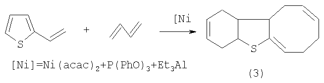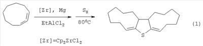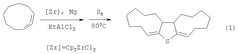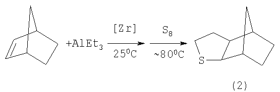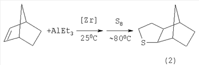 2, 386-391) получения трициклических тиофанов, например, 3-тиатетрацикло[5.2.1.02,6]декана (2) взаимодействием норборнена с AlEt3 под действием 3-5 мол.% катализатора Cp2ZrCl2 в углеводородных растворителях или без растворителя при температуре 25°С в течение 12-14 ч, с последующим прибавлением суспензии трехкратного избытка по отношению к AlEt3 элементной серы в бензоле и выдерживанием реакционной массы в течение 8 ч в кипящем бензоле при температуре ~80°С. Реакция протекает по схеме: