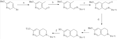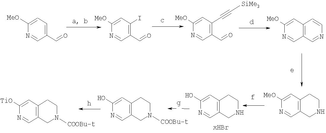 4-Йод-6-метоксиникотинальдегид (0,41 г, 1,6 ммоль), триметилсилилацетилен (0,35 мл, 2,8 ммоль), PdCl2(PPh3)2 (каталитическое количество), Cul (каталитическое количество), TEA (2 мл) и TFA (10 мл) перемешивали при 60°С в течение 2 ч. Летучие вещества выпаривали, остаток переносили в воду и экстрагировали эфиром. Органическую фазу сушили, фильтровали и концентрировали. В результате очистки колоночной хроматографией со смесью EtOAc-гептаны (1:3) в качестве элюента получали 0,25 г (выход 68%) 6-метокси-4-[(триметилсилил)этинил]никотинальдегида.