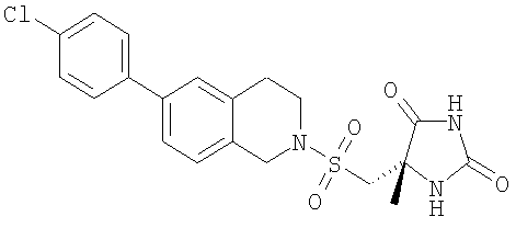 (5S)-5-{[(6-Бром-3,4-дигидроизохинолин-2(1Н)-ил)сульфонил]метил}-5-метилимидазолидин-2,4-дион (0,016 г, 0,04 ммоль), 4-хлорфенилбороновую кислоту (0,0072 г, 0,045 ммоль), PdCl2×dppf (0,003 г), 2 М карбонат натрия (0,15 мл), толуол (0,8 мл) и этанол (0,2 мл) перемешивали в закрытом сосуде при 95°С в течение 17 ч. Растворитель выпаривали и остаток переносили в воду. Раствор подкисляли 10%-ной НОАс до рН 6, а затем дважды экстрагировали EtOAc. Объединенные органические фазы промывали насыщенным рассолом бикарбоната натрия, сушили, фильтровали и концентрировали с получением неочищенного продукта.