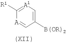 где R2 и В такие, как указано в формуле (I), и LG представляет собой уходящую группу; с производным бороновой кислоты формулы (XII)