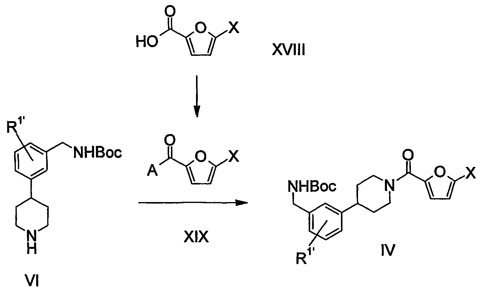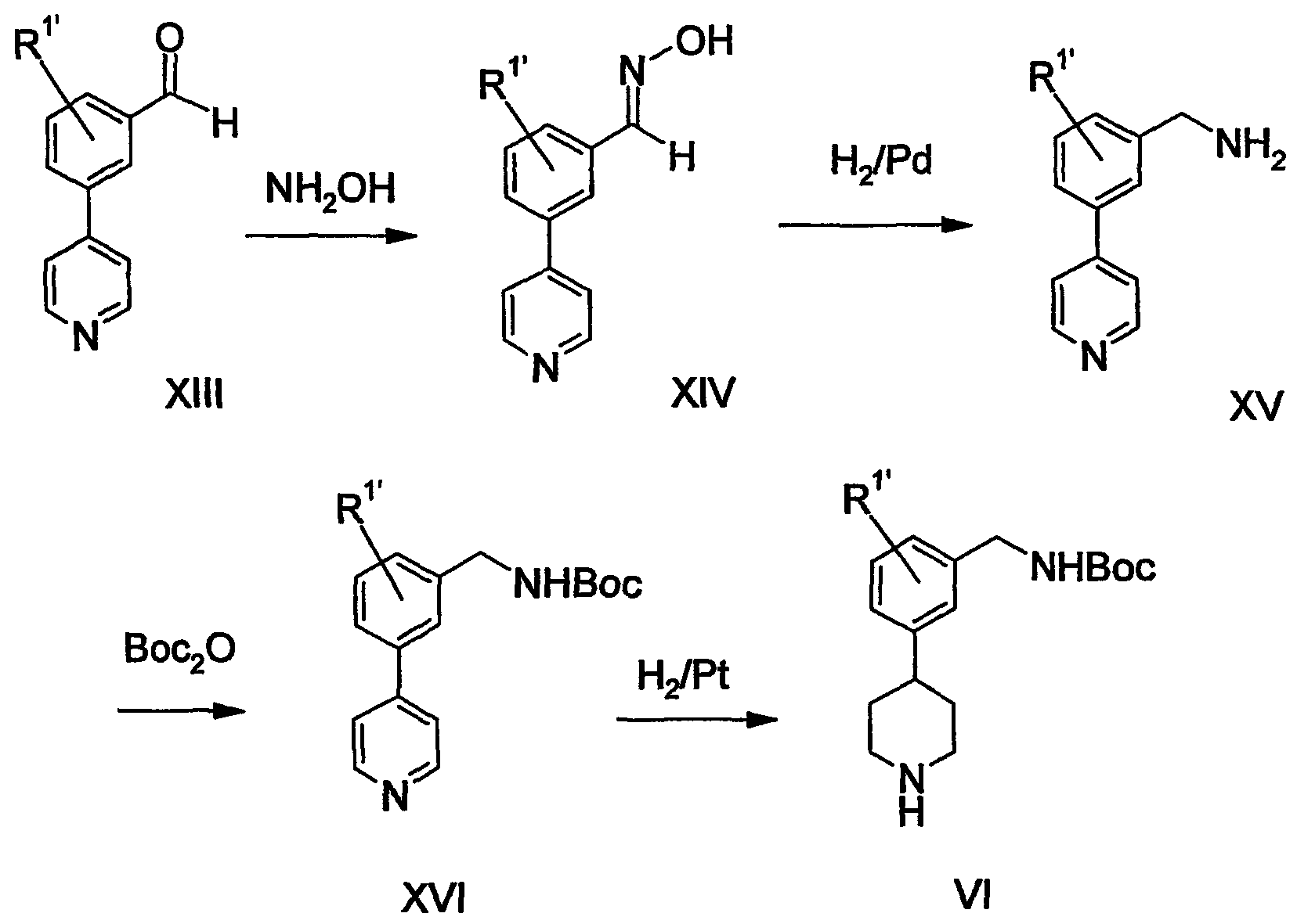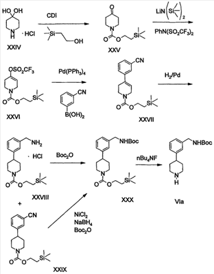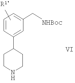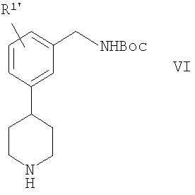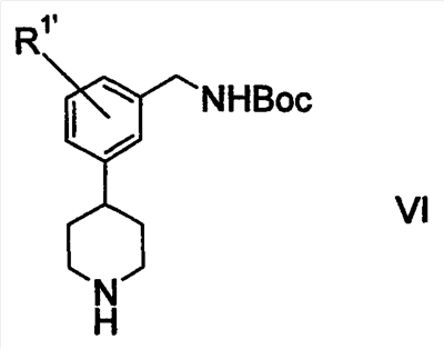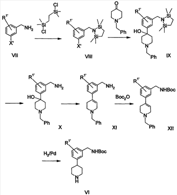 1. Способ получения соединения формулы VI 2. Способ по п.1 получения 4-[3-(трет-бутоксикарбониламинометил)фенил]пиперидина или его соли, включающий стадии: 3. Способ получения соединения формулы VI 4. Способ по п.3 получения 4-[3-(трет-бутоксикарбониламинометил)фенил] пиперидина или его соли, включающий стадии: 5. Способ получения соединения формулы VI 6. Способ по п.5 получения 4-[3-(трет-бутоксикарбониламинометил)фенил] пиперидина или его соли, включающий стадии: 7. Соединение формулы IX 8. Соединение по п.7, которое является 1-[3-(1-бензил-4-гидроксипиперидин-4-ил)бензил]-2,2,5,5-тетраметил-1-аза-2,5-дисилациклопентаном. 9. Соединение формулы X 10. Соединение по п.9, которое является 3-(1-бензил-4-гидроксипиперидин-4-ил)бензиламином или его солью. 11. Соединение формулы XI 12. Соединение по п.11, которое является 3-(1-бензил-1,2,3,6-тетрагидропиридин-4-ил)бензиламином или его солью. 13. Соединение формулы XII 14. Соединение по п.13, которое является трет-бутиловым эфиром 3-(1-бензил-1,2,3,6-тетрагидропиридин-4-ил)бензилкарбаминовой кислоты или его солью. 15. Соединение формулы XIV 16. Соединение по п.15, которое является оксимом 3-(4-пиридил)бензальдегида или его солью. 17. Соединение формулы XV 18. Соединение по п.17, которое является 3-(4-пиридил)бензиламином или его солью. 19. Соединение формулы XVI 20. Соединение по п.19, которое является трет-бутиловым эфиром 3-(4-пиридил)бензилкарбаминовой кислоты или его солью.