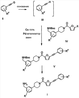 Данное изобретение относится к способам получения соединений, которые полезны в качестве ингибиторов триптазы, промежуточным продуктам, которые могут применяться в получении указанных соединений, способам получения таких промежуточных продуктов и их применению для получения указанных соединений. Уровень техники Опосредованные тучными клетками воспалительные заболевания, в частности астма, представляют собой проблему здравоохранения, приобретающую все большую важность. Астма часто характеризуется прогрессирующим развитием повышенной чувствительности трахеи и бронхов как к иммуноспецифическим аллергенам, так и к обычным химическим и физическим раздражителям, что приводит к развитию хронического воспаления. Лейкоциты, содержащие IgE-рецепторы, в особенности тучные клетки и базофилы, присутствуют в эпителии и в расположенных под ним тканях гладких мышц бронхов. Сначала эти лейкоциты активируются посредством связывания специфических, попадающих в организм при вдохе антигенов с IgE-рецепторами, и затем выделяют ряд химических медиаторов. Например, дегрануляция тучных клеток приводит к выделению протеогликанов, пероксидазы, арилсульфатазы B, химазы и триптазы, в результате чего происходит сужение бронхиолы. Триптаза хранится в секреторных гранулах тучных клеток и является основной секреторной протеазой тучных клеток человека. Триптаза участвует в разнообразных биологических процессах, включая разложение сосудорасширяющих и бронхорелаксирующих нейропептидов (Caughey et al., J. Pharmacol. Exp. Ther., 1988, 244, стр. 133-137; Franconi et al., J. Pharmacol. Exp. Ther., 1988, 248, стр. 947-951; и Tam et al., Am. J. Respir. Cell Mol. Biol., 1990, 3, стр. 27-32) и модуляцию бронхиальной чувствительности к гистамину (Sekizawa et al., J. Clin. Invest., 1989, 83, стр. 175-179). Таким образом, считается, что ингибиторы триптазы могут использоваться в качестве противовоспалительных средств (K. Rice, P.A. Sprengler, Current Opinion in Drug Discovery and Development, 1999, 2, стр. 463-474), в частности, для лечения хронической астмы (M.Q. Zhang, H. Timmerman, Mediators Inflamm., 1997, 112, стр. 311-317), а также для лечения и профилактики аллергического ринита (S.J. Wilson et al., Clin. Exp. Allergy, 1998, 28, стр. 220-227), воспалительной болезни кишечника (S.C. Bischoff et al., Histopathology, 1996, 28, стр. 1-13), псориаза (A. Naukkarinen et al., Arch. Dermatol. Res., 1993, 285, стр. 341-346), конъюнктивита (A.A. Irani et al., J. Allergy Clin. Immunol., 1990, 86, стр. 34-40), атопического дерматита (A. Jarvikallio et al., Br. J. Dermatol., 1997, 136, стр. 871-877), ревматоидного артрита (L.C Tetlow et al., Ann. Rheum. Dis., 1998, 54, стр. 549-555), остеоартрита (M.G. Buckley et al., J. Pathol., 1998, 186, стр. 67-74), подагрического артрита, ревматоидного спондилита и заболеваний с разрушением хрящей суставов. Кроме того, было показано, что триптаза является сильным митогеном для фибробластов, что указывает на ее возможное участие в пневмофиброзе при астме и интерстициальных легочных способах (Ruoss et al., J. Clin. Invest., 1991, 88, стр. 493-499). Поэтому считается, что ингибиторы триптазы могут использоваться для лечения и профилактики фиброзных заболеваний (J.A. Cairns, A.F. Walls, J. Clin. Invest., 1997, 99, стр. 1313-1321), например фиброза, склеродермии, пневмофиброза, цирроза печени, миокардиального фиброза, нейрофибром и гипертрофических рубцов. Кроме того, считается, что ингибиторы триптазы могут использоваться для лечения и профилактики инфаркта миокарда, удара, стенокардии и прочих последствий разрыва атеросклеротических бляшек (M. Jeziorska et al., J. Pathol., 1997, 182, стр. 115-122). Также было обнаружено, что триптаза активирует 