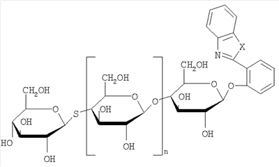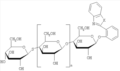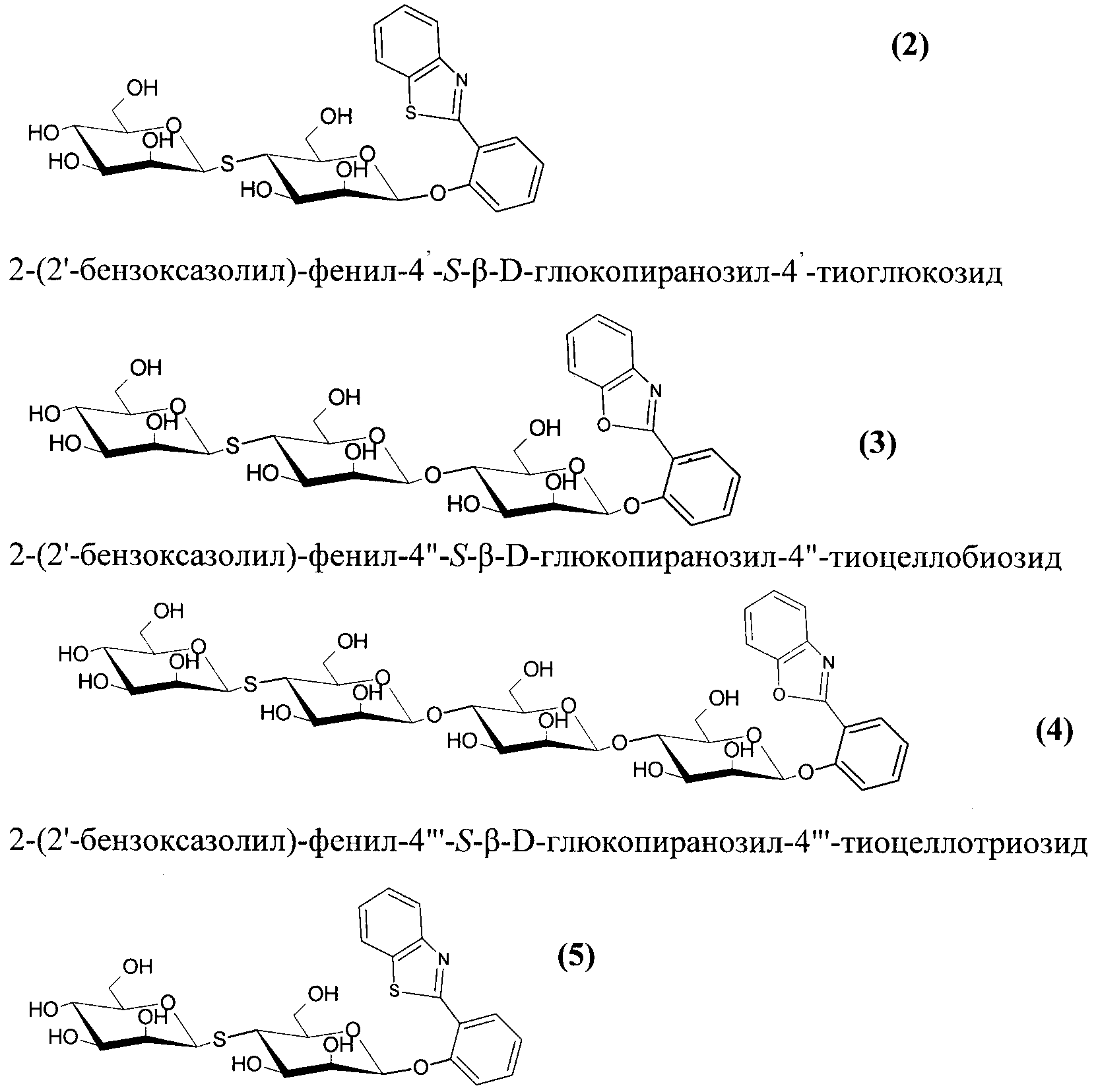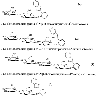Были синтезированы 2-(2′-бензоксазолил)-фенил-4′-S- -D-глюкопиранозил-4′-тиоглюкозид (2), 2-(2′-бензоксазолил)-фенил-4″-S- -D-глюкопиранозил-4″-тиоцеллобиозид (3), 2-(2′-бензоксазолил)-фенил-4″‘-S- -D-глюкопиранозил-4″‘-тиоцеллотриозид (4) и 2-(2′-бензотиазолил)-фенил-4’-S- -D-глюкопиранозил-4′-тиоглюкозид (5).