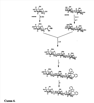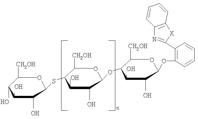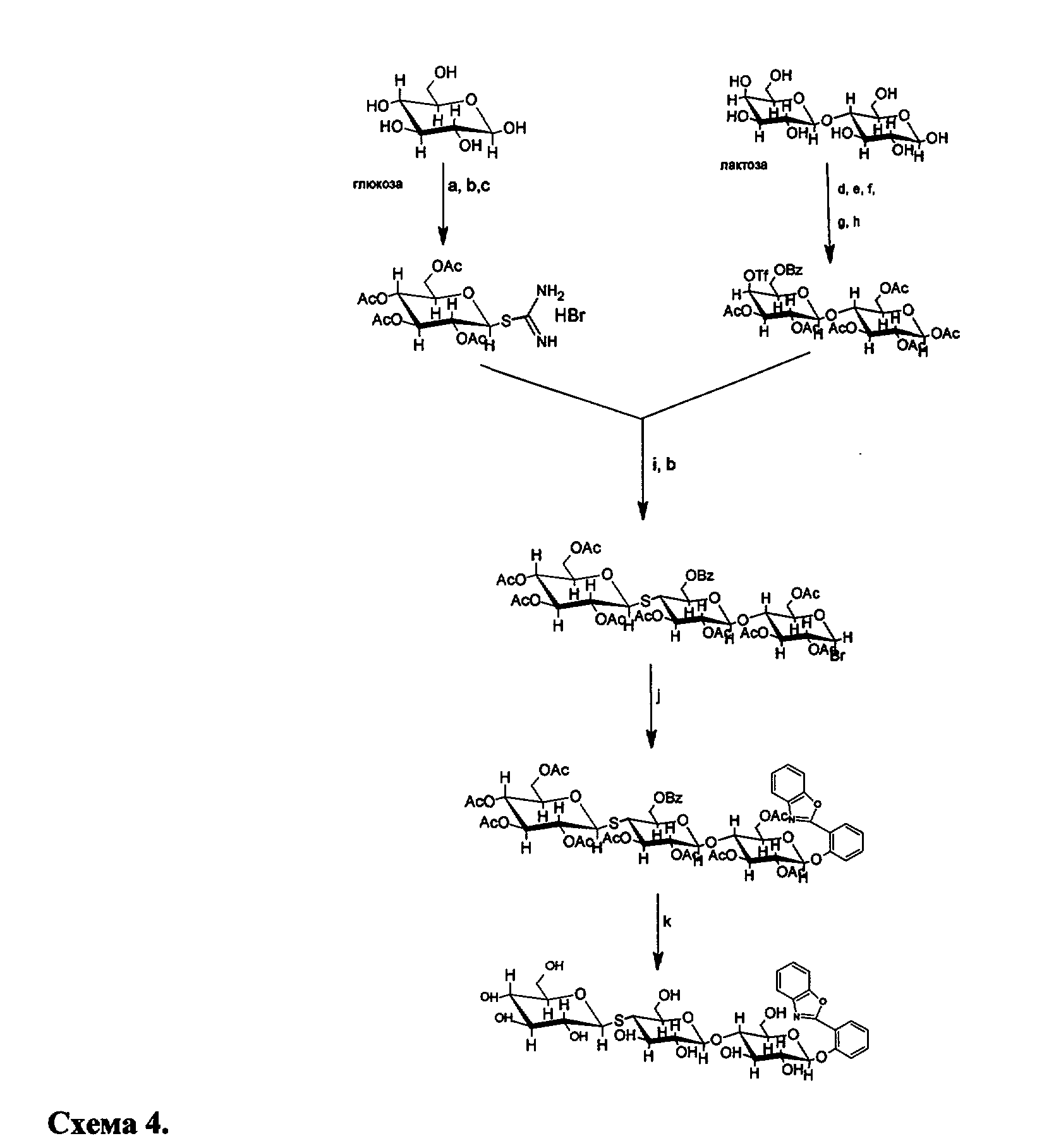 Получение соединений по общей формуле (1), где Х представляет собой атом кислорода, иллюстрируется следующим примером синтеза 2-(2′-бензоксазолил)-фенил-4″-S- -D-глюкопиранозил-4″-тиоцеллобиозида, где (а) уксусный ангидрид, ацетат натрия; (b) НВr/ АсОН; (с) тиомочевина; (d) бензальдегиддиметилацеталь, TosOH; (e) уксусный ангидрид, пиридин; (f) AcOH/ вода, 80%; (g) бензоил хлорид, пиридин; (h) трифторметансульфоновый ангидрид; (i) триэтиламин; (j) 2-(2′-гидроксифенил)-бензоксазол, карбонат серебра; (k) метилат натрия (схема 4).