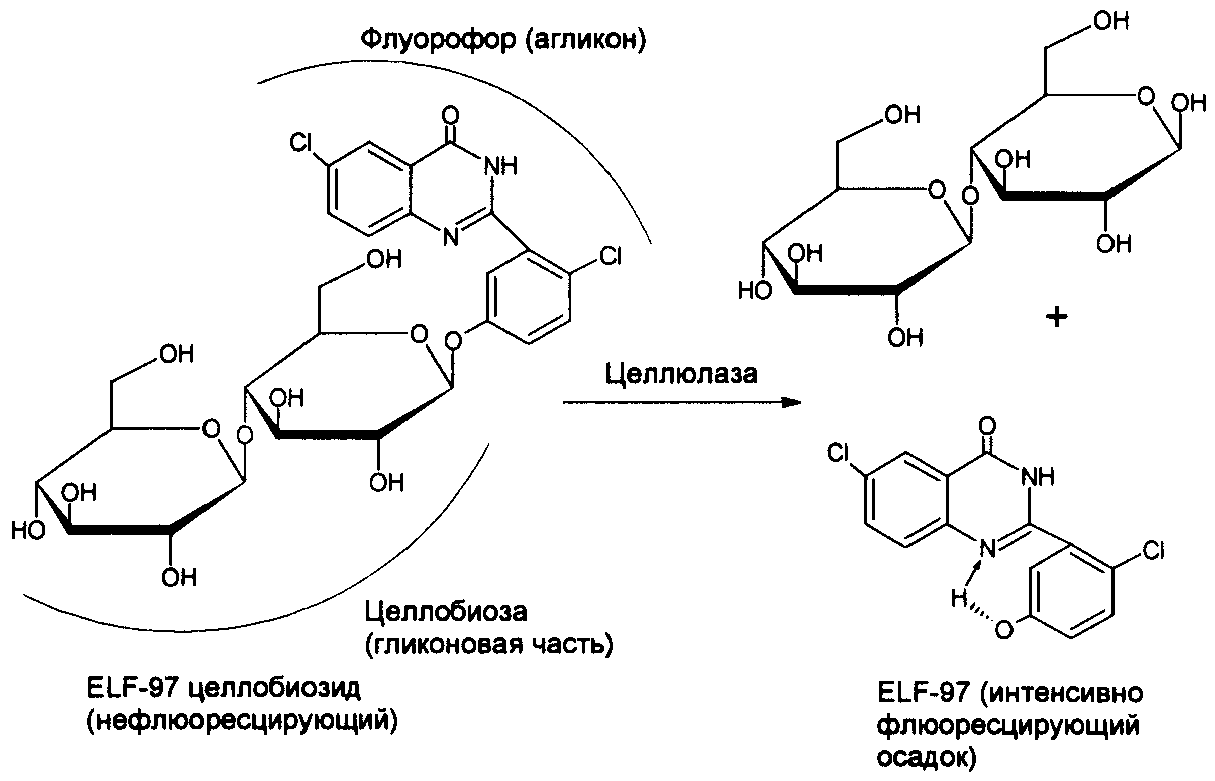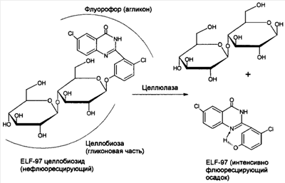 Известен субстрат из класса олигосахаридов, модифицированных флуоресцентной меткой, для детектирования гликозидгидролаз целлюлазного комплекса на твердых средах, так называемый ELF-97 целлобиозид [1]. В основе метода с использованием ELF-97 целлобиозида лежит применение в качестве флуорофорной группы 2-(2′-гидроксифенил)-4(3Н)-хиназолинона. Предложенный субстрат является бесцветным и нефлуоресцентным. При его гидролизе ферментами целлюлазного комплекса непосредственно в месте проявления ферментативной активности образуются интенсивно флюоресцирующий и фотостабильный, не растворимый в воде осадок. Реакция ферментативного расщепления ELF-97 -D-целлобиозида приведена на схеме 2.