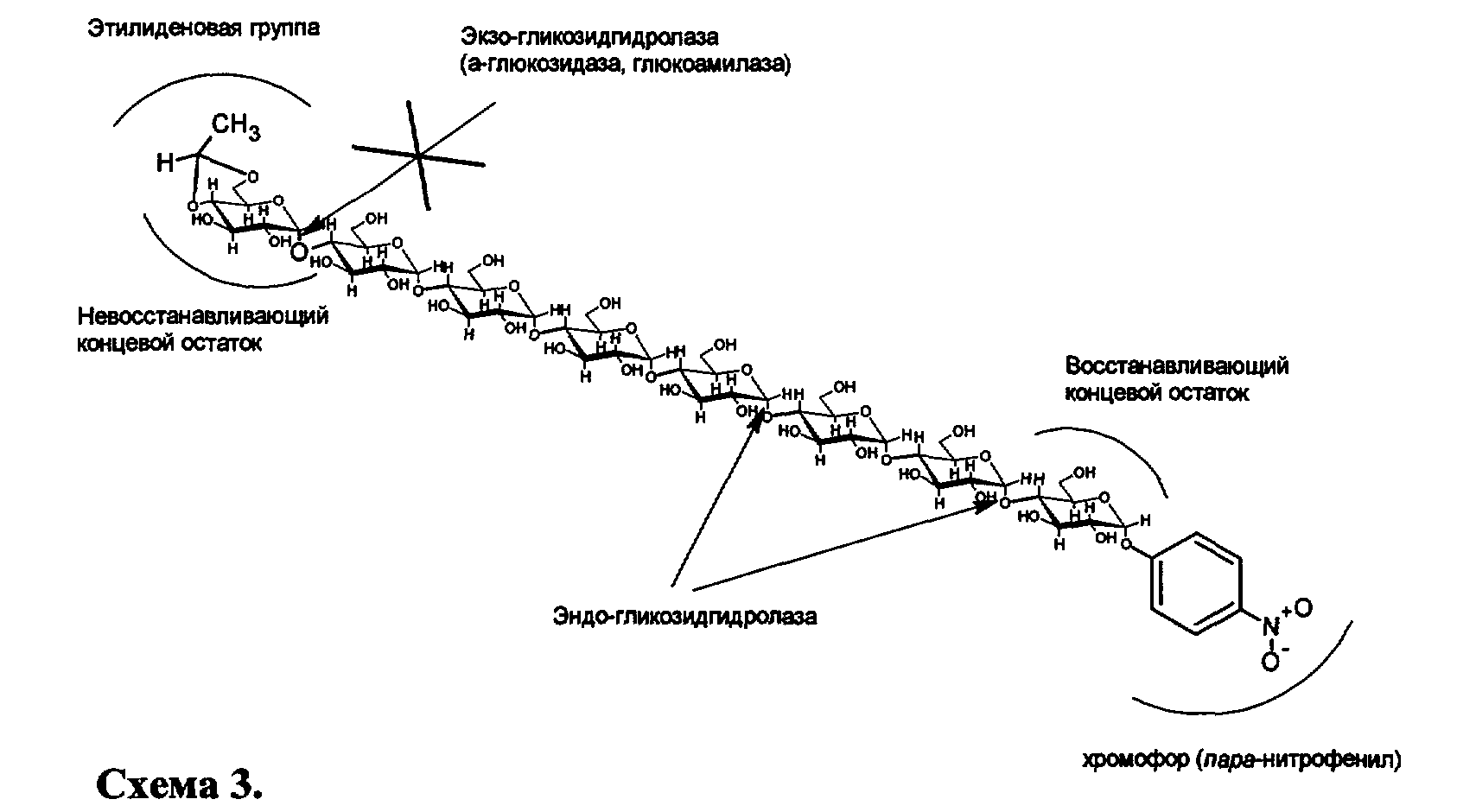 Наиболее близким к заявляемым субстратам является субстрат из класса олигосахаридов, пригодный для детектирования эндо-гликозидгидролаз в присутствии экзо-действующих ферментов, а именно этилиден-пара-нитрофенил- -D-мальтогептаозид (коммерческое название EPS) [5]. Он модифицирован хромофорной группой пара-нитрофенол, растворим в воде и широко используется для определения активности амилаз в биологических жидкостях в присутствии экзо-действующих -глюкозидаз или глюкоамилаз. Гидролиз подобного субстрата происходит только под воздействием эндо-действующих гликозидгидролаз ( – и -амилаз), т.к. модификация концевого глюкозного остатка олигосахаридной части субстрата этилиденовой группой не позволяет экзо-гликозидгидролазам связываться с молекулой субстрата и соответственно расщеплять его. Реакция гидролиза этилиден-пара-нитрофенил- -D-мальтогептаозида приведена на схеме 3. Стрелками указаны места расщепления олигосахаридной цепи.