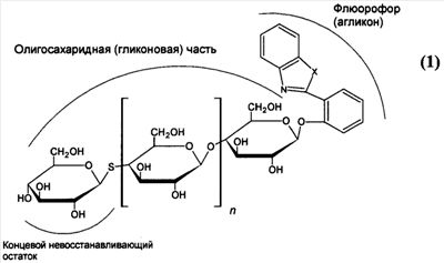 Углеводные блоки для соединений, соответствующих общей формуле (1), где Х представляет собой атом кислорода, были синтезированы химически из лактозы и глюкозы. Ключевым моментом синтеза является создание -1,4-тиогликозидной связи между двумя концевыми молекулами глюкозы требуемого субстрата. Для этого 4′-трифлильный эфир 1,2,3,6,2′,3′-O-ацетил-6′-O-бензоил-лактозы обрабатывали ацетилированной 1-тиоглюкозой [10]. Полученный защищенный трисахарид активировали переводом в галогенированную форму, которую обрабатывали либо флуорофором с образованием 2-(2′-бензоксазолил)-фенил-4″-S- -D-глюкопиранозил-4″-тиоцеллобиозида, либо 2-(2′-бензоксазолил)-фенил-2,3,6-O-ацетил-глюкопиранозидом для получения 2-(2′-бензоксазолил)-фенил-4′”-S- -O-глюкопиранозил-4′”-тиоцеллотриозида.