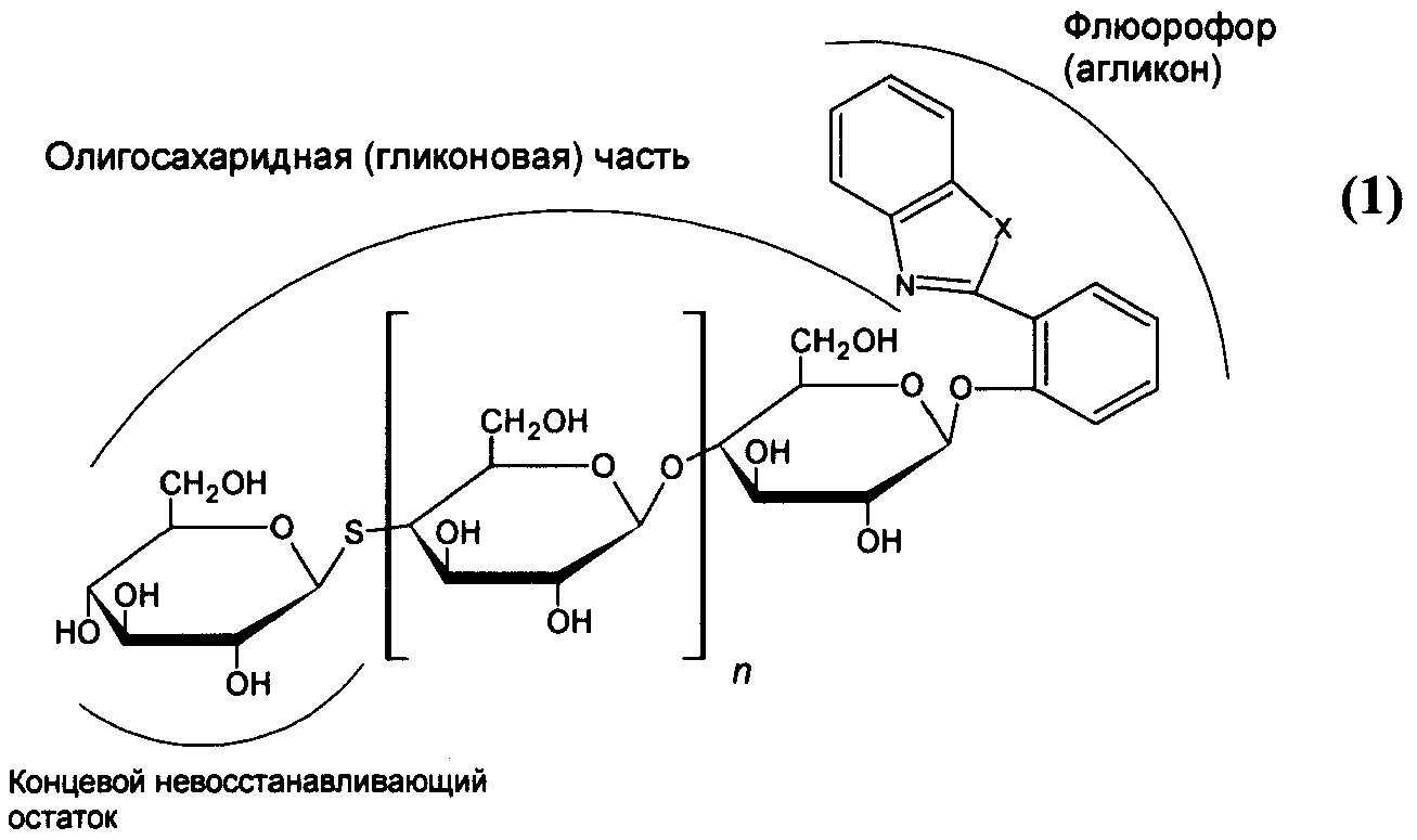 где агликоновая часть обеспечивает возможность детектирования на твердых средах и представляет собой нерастворимую флуоресцентную метку, в которой Х – это атом кислорода или атом серы, а концевой невосстанавливающий сахарный остаток связан с остальной (гликоновой) частью молекулы субстрата тио-связью, причем n 0.