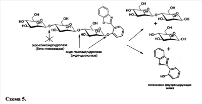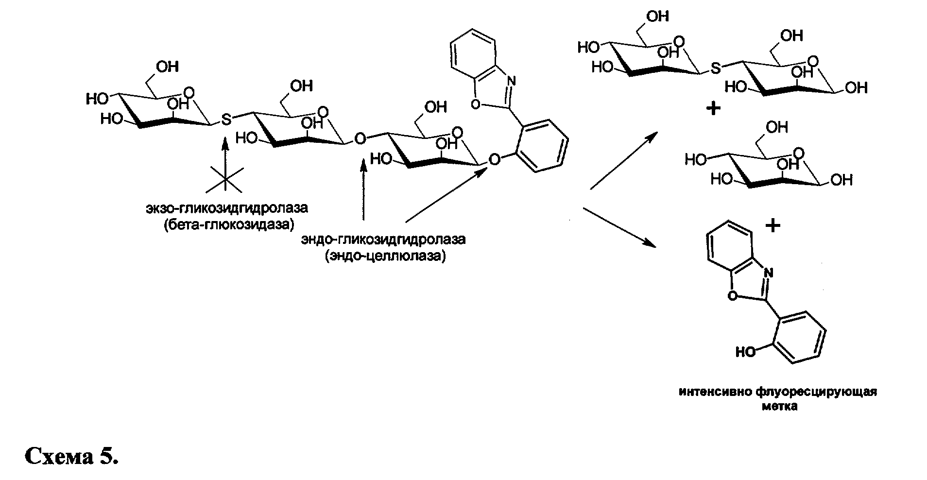 Пример действия ферментов целлюлазного комплекса (экзо- и эндо-гликозидгидролаз) на один из заявляемых субстратов, 2-(2′-бензоксазолил)-фенил-4″-S- -D-глюкопиранозил-4″-тиоцеллобиозид, приведен на схеме 5.