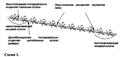 Определение ферментативной активности гликозидгидролаз в реальных биологических объектах сопряжено с проблемой одновременного присутствия в среде ферментов, обладающих разными типами действия (эндо- и экзо-) по отношению к одному и тому же субстрату. Например, целлюлазные комплексы, продуцируемые различными микроорганизмами, представляют собой многокомпонентные системы, состоящие из ферментов, различающихся по молекулярному строению и способу действия на целлюлозу. Так, ферменты целлюлазного комплекса разделяют на эндо-действующие целлюлазы, к которым относятся эндо-глюканазы, и экзо-целлюлазы, к которым относятся целлобиогидролазы и -глюкозидазы. Эндоглюканазы расщепляют внутренние связи в молекулах целлюлозы, действуя, главным образом, на аморфные участки (или микродефекты) целлюлозных волокон. Целлобиогидролазы атакуют молекулы целлюлозы с невосстанавливающего концевого остатка поли- или олигосахаридной цепи, последовательно отщепляя целлобиозные остатки (димеры). Наконец, -глюкозидазы отщепляют только концевые глюкозные остатки (мономеры) при гидролизе молекул целлобиозы и растворимых целлоолигосахаридов. Гидролиз целлюлозы эндо- и экзо-гликозидгидролазами целлюлазного комплекса приведен на схеме 1.