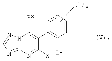 где Rx означает группу NR14R15 или неразветвленный или разветвленный C1-C8-алкил, который в случае необходимости, замещен галогеном, ОН, C1-C4-алкокси, фенилом или С3-С6-циклоалкилом, С2-С6-алкенил, С3-С6-циклоалкил, С3-С6-циклоалкенил, фенил или нафтил, причем 4 названных последними остатка могут иметь 1, 2, 3 или 4 заместителя, выбранных из группы, включающей галоген, ОН, С1-С4-алкил, С1-С4-галогеналкокси, C1-С4-алкокси и С1-С4-галогеналкил; R14, R15 независимо друг от друга означают водород, C1-C8-алкил, C1-C8-галогеналкил, С3-С10-циклоалкил, С3-С6-галогенциклоалкил, С2-C8-алкенил, С4-С10-алкадиенил, С2-С8-галогеналкенил, С3-С6-циклоалкенил, С2-С8-галогенциклоалкенил, С2-С8-алкинил, C2-C8-галогеналкинил или С3-С6-циклоалкинил, R14 и R15 вместе с атомом азота, к которому они присоединены, образуют пяти- до восьмичленный гетероциклил, который присоединен через N и содержит два или три дальнейших гетероатома из группы О, N и S в качестве кольцевых членов и/или может иметь один или несколько заместителей, выбранных из группы, включающей галоген, C1-С6-алкил, C1-С6-галогеналкил, С2-С6-алкенил, С2-С6-галогеналкенил, C1-С6-алкокси, C1-С6-галогеалкокси, С3-С6-алкенилокси, С3-С6-галогеналкенилокси, (эксо)-С1-С6-алкилен и окси-С1-С3-алкиленокси; L выбран из группы, включающей галоген, циано, C1-С6-алкил, С1-С4-галогеналкил, C1-С6-алкокси, С1-С4-галогеналкокси и C1-С6-алкоксикарбонил; L1 означает галоген, C1-С6-алкил или C1-С6-галогеналкил и в особенности фтор или хлор; Х означает галоген, С1-С4-алкил, циано, С1-С4-алкокси или С1-С4-галогеналкил и предпочтительно галоген или метил и в особенности хлор. Примерами для соединений формулы V являются 5-хлор-7-(4-метилпиперидин-1-ил)-6-(2,4,6-трифторфенил)-[1,2,4]триазоло[1,5-а]пиримидин, 5-хлор-7-(4-метилпиперазин-1-ил)-6-(2,4,6-трифторфенил)-[1,2,4]триазоло[1,5-а]пиримидин, 5-хлор-7-(морфолин-1-ил)-6-(2,4,6-трифторфенил)-[1,2,4]триазоло[1,5-а]пиримидин, 5-хлор-7-(пиперидин-1-ил)-6-(2,4,6-трифторфенил)-[1,2,4]триазоло[1,5-a]пиримидин, 5-хлор-7-(морфолин-1-ил)-6-(2,4,6-трифторфенил)-[1,2,4]триазоло[1,5-a]пиримидин, 5-хлор-7-(изопропиламино)-6-(2,4,6-трифторфенил)-[1,2,4]триазоло[1,5-a]пиримидин, 5-хлор-7-(циклопентиламино)-6-(2,4,6-трифторфенил)-[1,2,4]триазоло[1,5-a]пиримидин, 5-хлор-7-(2,2,2-трифторэтиламино)-6-(2,4,6-трифторфенил)-[1,2,4]триазоло[1,5-a]пиримидин, 5-хлор-7-(1,1,1-трифторпропан-2-иламино)-6-(2,4,6-трифторфенил)-[1,2,4]триазоло[1,5-a]пиримидин, 5-хлор-7-(3,3-диметилбутан-2-иламино)-6-(2,4,6-трифторфенил)-[1,2,4]триазоло[1,5-a]пиримидин, 5-хлор-7-(циклогексилметил)-6-(2,4,6-трифторфенил)-[1,2,4]триазоло[1,5-a]пиримидин, 5-хлор-7-(циклогексил)-6-(2,4,6-трифторфенил)-[1,2,4]триазоло[1,5-a]пиримидин, 5-хлор-7-(2-метилбутан-3-ил)-6-(2,4,6-трифторфенил)-[1,2,4]триазоло[1,5-a]пиримидин, 5-хлор-7-(3-метилбутан-1-ил)-6-(2,4,6-трифторфенил)-[1,2,4]триазоло[1,5-a]пиримидин, 5-хлор-7-(4-метилциклогексан-1-ил)-6-(2,4,6-трифторфенил)-[1,2,4]триазоло[1,5-a]пиримидин, 5-хлор-7-(гексан-3-ил)-6-(2,4,6-трифторфенил)-[1,2,4]триазоло[1,5-a]пиримидин, 5-хлор-7-(2-метилбутан-1-ил)-6-(2,4,6-трифторфенил)-[1,2,4]триазоло[1,5-a]пиримидин, 5-хлор-7-(3-метилбутан-1-ил)-6-(2,4,6-трифторфенил)-[1,2,4]триазоло[1,5-a]пиримидин, 5-хлор-7-(1-метилпропан-1-ил)-6-(2,4,6-трифторфенил)-[1,2,4]триазоло[1,5-a]пиримидин, 5-метил-7-(4-метилпиперидин-1-ил)-6-(2,4,6-трифторфенил)-[1,2,4]триазоло[1,5-a]пиримидин, 5-метил-7-(4-метилпиперазин-1-ил)-6-(2,4,6-трифторфенил)-[1,2,4]триазоло[1,5-a]пиримидин, 5-метил-7-(морфолин-1-ил)-6-(2,4,6-трифторфенил)-[1,2,4]триазоло[1,5-a]пиримидин, 5-метил-7-(пиперидин-1-ил)-6-(2,4,6-трифторфенил)-[1,2,4]триазоло[1,5-a]пиримидин, 5-метил-7-(морфолин-1-ил)-6-(2,4,6-трифторфенил)-[1,2,4]т