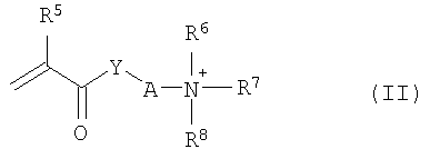 где R5 означает водород или C1-C4-алкил, в особенности водород или метил, R6, R7 означают независимо друг от друга C1-C4-алкил, в особенности метил, и R8 означает водород иди C1-C4-алкил, в особенности водород или метил, Y означает кислород, NH или NR9, где R9 означает С1-C4-алкил, А означает С2-С8-алкилен, например 1,2-этандиил, 1,2- или 1,3-пропандил, 1,4-бутандиил или 2-метил-1,2-пропандиил, который в случае необходимости может быть прерван 1, 2 или 3 несмежными атомами кислорода, и Z– означает эквивалент аниона, например Cl–, HSO4 и R8 означает Н свободные основания мономеров формулы II. Примерами таких мономеров M1с.2k являются 2-(N,N-диметиламино)этилакрилат, 2-(М,М-диметиламино)этилметакрилат, 2-(N,N-диметиламино)этилакриламид, 3-(N,N-диметиламино)пропилариламид, 3-(N,N-диметиламино)пропилметилакриламид, 2-(N,N-диметиламино)этилметакриламид, 2-(N,N,N-триметиламмоний)этилакрилат-хлорид, 2-(N,N,N-триметиламмоний)этилметакрилат-хлорид, 2-(N,N,N-триметиламмоний)этилметакриламид-хлорид, 3-(N,N,N-триметиламмоний)пропилакриламид-хлорид, 3-(N,N,N-триметиламмоний)пропилметкриламид-хлорид, 2-(N,N,N-триметиламмоний)этилакриламид-хлорид, а также соответствующие метосульфаты и сульфаты. Другими пригодными мономерами M1с.2k являются винилпиридины винилимидазол и их продукты кватеринизирования. Доля мономеров M1с.2k составляет предпочтительно не более чем 20 вес.%, например, от 0,1 до 20 вес.%, в особенности от 0,5 до 15 вес.%, и особенно предпочтительно от 1 до 10 вес.%, в пересчете на общее количество мономеров M1. При одной предпочтительной форме выполнения полимер Р1 не содержит состоянии или содержит в полимеризированном не более чем 0,1 вес.% мономеров M1c.2k. К мономерам М1с относятся также и мономеры М1с.3, которые имеют две или более не конъюгированных этиленовоненасыщенных двойных связей. Доля подобных мономеров М1с.3 составляет, как правило, не более чем 2 вес.% и в особенности не более чем 0,5 вес.%, в пересчете на общее количество мономеров M1. Примерами для этого являются сложные виниловые и аллиловые эфиры моноэтиленовоненасыщенных карбоновых кислот, такие как аллилакрилат и аллилметакрилат, ди- и полиакрилаты ди- или полиолей, такие как этиленгликольдиакрилат, этиленгликольметакрилат, бутандиолдиакрилат, бутандиолдиметакрилат, гексадиолдиакрилат, гексадиолдиметакрилат, триэтиленогликольдиакрилат, триэтиленгликольтриметакрилат, трис(гидроксиметил)этантриакрилат и -триметакрилат, пентаэритриттриакрилат и -триметакрилат, далее сложные аллиловые и металлиловые эфиры полифункциональных карбоновых кислот, такие как диаллилмалеат, диаллилфумарат, диаллилфталат.Типичными мономерами М1с.3 являются также такие соединения как дивинилбензол, дивинилмочевина, диаллилмочевина, триаллилцианурат, N,N’-дивинил- и N,N’-диаллилимидазолидин-2-он, а также метиленбисакриламид и метиленбисметакриламид. Согласно изобретению полимеры Р1 несут реакционно-способные функциональные группы RP1, которые реагируют с изоцианатными группами при образовании связей. Среднее число подобных групп на молекулу полимера (функциональность), как правило, составляет не более чем две и лежит предпочтительно в интервале от 0,5 до 1,5 и, особенно в интервале от 0,6 до 1,4. Функциональная группа RP1 может быть расположена в полимерной цепи и находится предпочтительно на конце полимерной цепи. При учете применения амфифильных полимерных композиций со