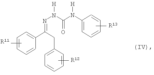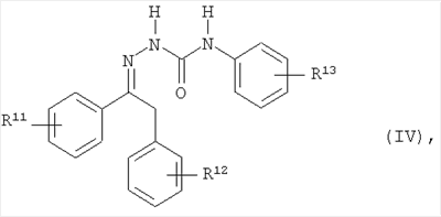 – N-фенилсемикарбазоны, описанные в ЕР-А 462456 общей формулой I, в особенности соединения общей формулы IV где R11 и R12 независимо друг от друга означают водород, галоген, CN, С1-С4-алкил, С1-С4-алкокси, С1-С4-галоалкил или С1-С4-галоалкоси и R13 означает С1-С4-алкокси, С1-С4-галоалкил или С1-С4-галоалкокси, например соединение IV, где R11 означает 3-CF3 и R12 означает 4-CN, и R13 означает 4-ОСF3 (метафлумизон). Приемлемыми регуляторами роста являются, например, хлормекват-хлорид, мепикватхлорид, прогексадион-кальций или группа гиббереллинов. К ним относятся, напрмер, гиббереллиные GA1, GA3, GA4, GA5 и GA7 и т.п. и соответствующие эксо-16,17-дигидрогиббереллины, а также их производные. например, сложные эфиры с С1-С4-кабоновыми кислотами. Согласно изобретению предпочтителен эксо-16,17-дигидро-GA5-13-ацетат, далее 1-нафтилацетамид, 1-нафтилуксусная кислота, 2-нафтилоксиуксусная кислота, 3-СРА, 4-СРА, анцимидон, антрахинон, ВАР, бутифос; трибуфос, бутралин, далее хлорфлуренол, клофенцет, цикланилид, диаминозид, дикамба, дикегулак натрия, диметипин, хлорфенетол, этацелазил, этефон, этиклозат, фенопроп, 2,4,5-ТР, флуоридамид, флюрпримидол, флутриафол, гуазатин, имазалил, индолилмаслянная кислота, индолилуксусная кислота, каретазан, кинетин, лактидихлор-этил, малеиновый гидразид, мефлуидин, напталам, паклобутразол, хинмерак, синтофен, тетциклациз, тридиазурон, трииодобезоикакаид, триапентенол, триазетан, трибуфос, тринексапас-этил и юниконазол. Предпочтительная форма выполнения изобретения относится к применению амфифильных полимерных композиций согласно изобретению для получения водных композиций действующих веществ, таких, как фунгициды, в частности стробилуринов, азолов и 6-арилтриазоло[1,5-a]пиримидинов, описанных, например, в WO 98/46608, WO 99/41255 или WO 03/004465 общей формулой I, в особенности для действующих веществ общей формулы V,