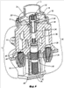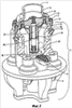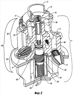 Фиг.3 изображает вариант осуществления режущего инструмента 1. Фиг.3 поясняет взаимосвязь, существующую в некоторых вариантах осуществления между вертикально шлицованной мачтой 32 и основным корпусом устройства 8 отвода потока. В некоторых вариантах осуществления, основной корпус 10 устройства 8 отвода потока может быть соединен с вертикально шлицованной мачтой 32 набором вертикальных шлицов, которые преобразовывают вращение вертикально шлицованной мачты 32 во вращение основного корпуса 10 устройства 8 отвода потока. Фиг.3 дополнительно иллюстрирует вариант осуществления буртика 38 сдвигающего устройства. В некоторых вариантах осуществления буртик 38 окружает вертикально шлицованную мачту 32 и удерживает второй вращательный храповой механизм 30 относительно вертикально шлицованной мачты 32. В некоторых вариантах осуществления, сдвигающий буртик 38 может состоять из маленьких каналов 34, которые позволяют текучим средам в режущей головке 1 соприкасаться с верхней поверхностью спирального шлица 36. В некоторых вариантах осуществления сдвигающее устройство 38 также действует, чтобы поддерживать дно основного корпуса 10, сохраняя установленные вертикальные допуски внутри корпуса режущего инструмента 1.