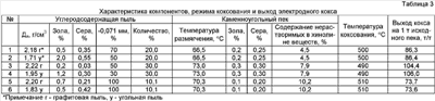 кроме того, введение пылевых отходов осуществляют при загрузке сырья в печь коксования. Углеродсодержащие отходы, которые вводят в каменноугольный пек (таблица 1), представляют собой пыли, уловленные электрофильтрами при механической обработке графитированной, и электрофильтровые пыли механической обработки обожженной угольной продукции, изготовленной на основе термоантрацита (таблица 2).