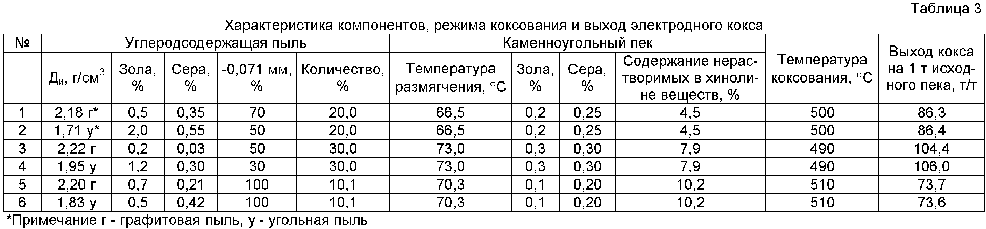 Повышение выхода пекового электродного кокса и одновременно утилизация УПО достигаются применением комбинирования сырья коксования и ведением процесса в соответственно других условиях. Процесс начинают смешением среднетемпературного каменноугольного пека с температурой размягчения 65-73°С, взамен высокотемпературного с температурой размягчения 135-150°С, используемого в технологии получения пекового кокса и УПО при массовом соотношении СТП:УПО 70,0-89,9:10,1 – 30%, затем смесь подвергают коксованию при температуре 500±10°С, получают сырой пековый кокс с выходом летучих веществ 7,9-14,5%. Общий выход сырого пекового кокса на 1 тонну исходного пека составляет 770-1060 кг/т, против 680-750 т/т (В.Е.Привалов, М.А.Степаненко. Каменноугольный пек. М., 1981, 208 с., табл.43 на стр.127), одновременно утилизируется 0,110-0,428 т/т углеродсодержащих пылевых отходов. Повышенный выход сырого пекового кокса при коксовании среднетемпературного пека с введением пылевых частиц объясняется тем, что пылевые частички, с одной стороны, служат локальными центрами коксообразования, а с другой стороны, среднетемпературный пек, как менее вязкая среда, чем высокотемпературный пек, в меньшей степени препятствует прохождению коксогенов на поверхность пылевых частичек. Кроме того, углеродсодержащие пылевые частицы имеют более высокую теплопроводность, чем каменноугольный пек. Поэтому они выполняют роль обогревающей подложки, способствующей коксованию пека изнутри системы. При этом теплопроводность графита больше, чем у обожженного материала, вследствие этого происходит некоторый «перегрев», способствующий разложению пека и незначительному снижению выхода кокса, но при этом полученный кокс характеризуется более низким выходом летучих веществ, чем при использовании обожженных пылей. При введении пылей в заявляемых пределах (10,1-30,0%) выход кокса собственно из пека колеблется в пределах 61-63%. Увеличение пыли более 30,0% снижает этот показатель до 56-58%, к тому же не способствует получению кускового кокса. То есть с увеличением количества пылевого наполнителя снижается толщина пекового слоя, возрастает скорость разложения до значений, превосходящих скорость процессов коксообразования. Введение пыли меньше 10,1% приводит к недостаточной утилизации пылевидных отходов электродных производств. Содержание компонентов в пределах 10,1-30,0% обеспечивает достижение необходимого технического результата. При использовании пылей с более высоким содержанием серы и зольности не гарантируется получение электродного кокса, соответствующего требованиям по сере (не более 1,0% для изготовления графитированной продукции; не более 1,5% – для изготовления анодов, применяемых для получения алюминия путем электролиза криолит-глиноземных расплавов). Характеристика компонентов, режима коксования и выход пекового кокса представлены в таблице 3. Пековый кокс, полученный по заявляемому способу, по качеству малозольный, малосернистый с выходом летучих веществ на уровне нефтяных коксов замедленного коксования (таблица 4), может быть использован в качестве сырья для графитированной продукции по следующей технологической схеме: прокалка – дробление – классификация – дозирование – прессование. Примеры конкретного осуществления способа Пример 1. Графитированную пыль, уловленную электрофильтрами при м