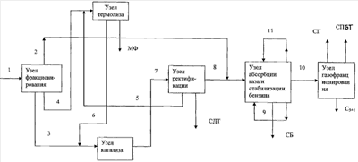Стабильный газовый конденсат 1 фракционируют с выделением следующих прямогонных фракций: бензиновой н.к. 90°С 2, фракции 90-260°С 3 и остаточной 4, выкипающей выше 260°С. Остаточную фракцию 4 в смеси с вторичной остаточной фракцией 5 подвергают термолизу при температуре 400-470°С. Остаток термолиза – мазут флотский МФ направляют в товарный парк. Пары термолиза 6 смешивают с прямогонной фракцией 90-260°С 3 и подвергают совместному контактированию с цеолитсодержащим катализатором. Продукты контактирования 7 подвергают ректификации для выделения бензиновой 8, дизельной и остаточной фракций 5. Разделение происходит за счет перепада температур по высоте аппарата (+120°С в верху колонны и +340°С в низу колонны). Дизельную фракцию подают на верхнюю тарелку стриппинг-колонны (на чертеже не приведена), где за счет отпарки легких компонентов происходит стабилизация дизельного топлива. Под нижнюю тарелку стриппинг-колонны подают водяной пар. Водяной пар с отпаренными легкими компонентами выводят с верха стриппинг-колонны и возвращают в ректификационную колонну. Стабильное дизельное топливо СДТ выводят в товарный парк. Бензиновые фракции 8 и 2 подают в узел абсорбции газов и стабилизации бензина, где в ректификационной колонне (на чертеже не приведена) происходит разделение нестабильного бензина на фракции: углеводородный газ 9, фракция н.к. 80°С 10, фракция 80-180°С 11. Углеводородные газы 9 поступают в нижнюю часть абсорбера. В верхнюю часть абсорбера для поглощения пропан-бутановой фракции из газа после охлаждения подают часть фракции 80-180°С 11 с колонны стабилизации бензина, а балансовую часть – стабильный бензин СБ направляют в товарный парк. Необходимое количество фракции н.к. – 80°С 10 подают на орошение верхней части колонны стабилизации, а балансовую часть 10 отводят на узел газофракционирования. Фракцию C5 и выше выводят с узла газофракционирования. Смесь СПБТ (смесь пропана-бутана технического) с узла газофракционирования отводят в товарный парк, а смесь легких углеводородов C1-С3 (сухой газ СГ) с узла газофракционирования отводят в топливную емкость.