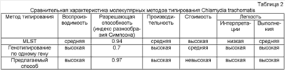 Изобретение относится к биотехнологии и микробиологии и представляет собой способ молекулярного типирования Chlamydia trachomatis путем секвенирования вариабельных участков трех генов Chlamydia trachomatis, таких как ompA, tsf, pmpF, полученных из бактериальной ДНК Chlamydia trachomatis, выделенной из клинического материала пациентов с урогенитальным хламидиозом, подвергнутых амплификации с последующим восстановлением последовательностей анализируемых генов, выравниванием и сравнительным анализом нуклеотидных последовательностей. Данный способ позволяет повысить разрешающую способность метода молекулярного типирования Chlamydia trachomatis, воспроизводимость и производительность способа, а также увеличить легкость интерпретации получаемых результатов и легкость выполнения. 2 табл.
