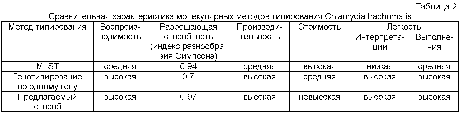 Изобретение относится к микробиологии и представляет собой способ молекулярного типирования Chlamydia trachomatis. Изобретение может быть использовано для изучения эпидемиологии урогенитального хламидиоза, оценки генетического родства отдельных штаммов возбудителя урогенитального хламидиоза – C.trachomatis – и выявления штаммов C.trachomatis, которые определяют характер клинического течения заболевания. Хламидии как возбудитель разнообразной патологии человека являются весьма гетерогенными. Среди более 20 представителей семейства Chlamydiaceae, объединенных в два рода (Chlamydia и Chlamydophila), известно как минимум три вида хламидий, вызывающих болезни человека: – Chlamydia pneumoniae (по современной номенклатуре Chlamydophila pneumoniae) – возбудитель инфекций дыхательных путей, в эксперименте показана роль этого микроорганизма в развитии атеросклероза, однако в клинике это однозначно не доказано; – Chlamydia psittaci (по современной номенклатуре Chlamydophila psittaci) – возбудитель пситтакоза; – Chlamydia trachomatis – возбудитель инфекций урогенитального тракта и ряда других; – другие хламидии могут вызывать болезни животных или лишены патогенных свойств. Возбудитель урогенитального хламидиоза Chlamydia trachomatis – относится к облигатным патогенам и передается от человека к человеку преимущественно половым путем. В течение последних лет в Российской Федерации заболеваемость урогенитальной хламидийной инфекцией вышла на первое место среди всех бактериальных инфекций, передаваемых половым путем (ИППП). В нашей стране сегодня урогенитальный хламидиоз – вторая по распространенности регистрируемая ИППП после трихомоноза. Разработка эффективных мероприятий по снижению уровня заболеваемости урогенитальным хламидиозом должна базироваться на четких представлениях об особенностях эпидемиологии этого заболевания. Одним из основных условий для решения этих вопросов является возможность выявления сходства и различия между штаммами бактерий одного биологического вида, выделенных от различных пациентов, то есть осуществления типирования. Одним из критериев выбора способа типирования является воспроизводимость метода и разрешающая (дискриминирующая) способность. При этом получаемые результаты должны легко учитываться и интерпретироваться без привлечения дополнительной экспертизы, под которой подразумевают способность метода оценить, как отдельные типы, штаммы, случайно отобранные из бактериальной популяции. Для количественной оценки дискриминирующей способности методов типирования применяют индекс разнообразия Симпсона (D) [Gaston, M.A. and P.R.Hunter. 1989. Efficient selection of tests for bacteriological typing schemes. J Clin Pathol 42: 763-766; Hunter, P. R. and M. A. Gaston. 1988. Numerical index of the discriminatory ability of typing systems: an application of Simpson’s index of diversity. J Clin Microbiol 26:2465-2466.], который рассчитывают по формуле: